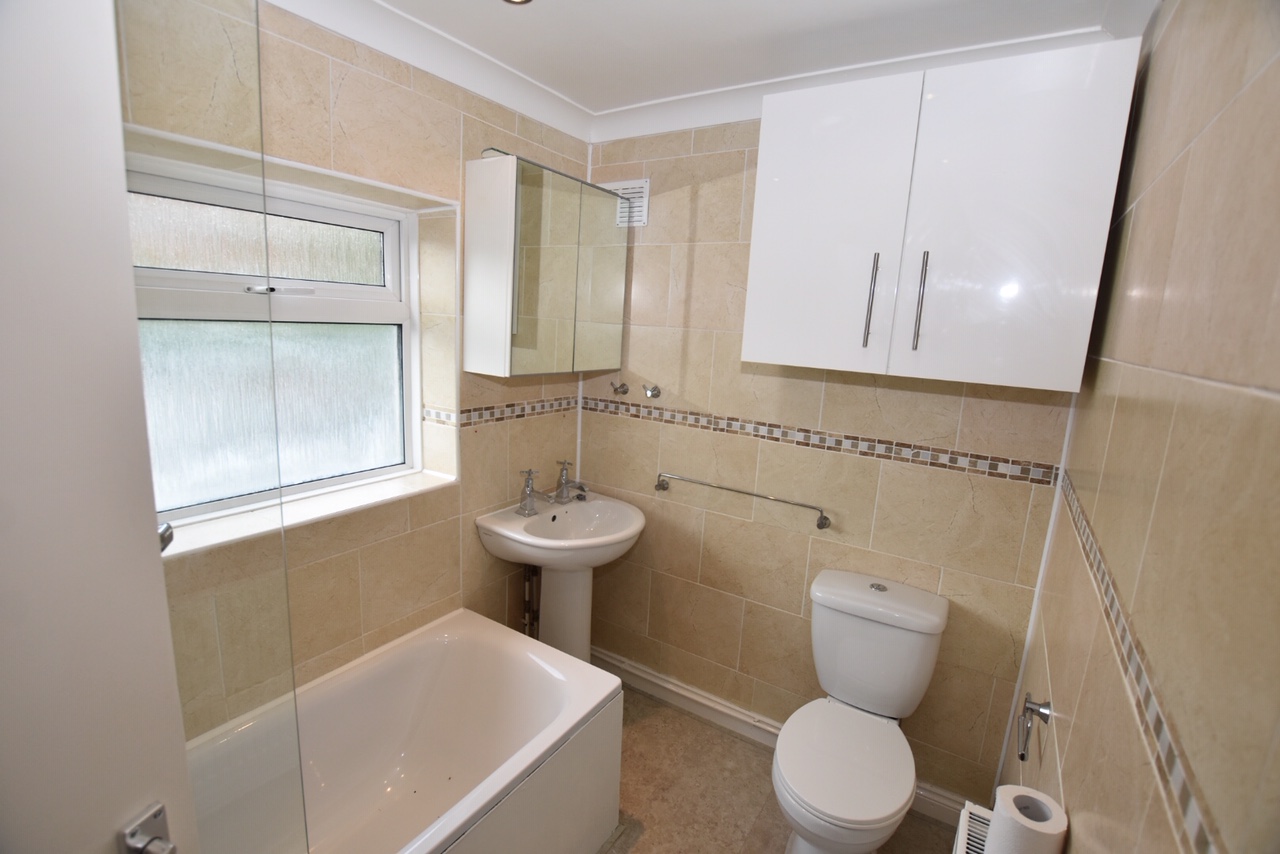 BATHROOM: - A white suite comprising of a panel enclosed bath with mixer taps, separate shower above, pedestal wash hand basin, low level WC, tiled walls, side aspect frosted double glazed window.