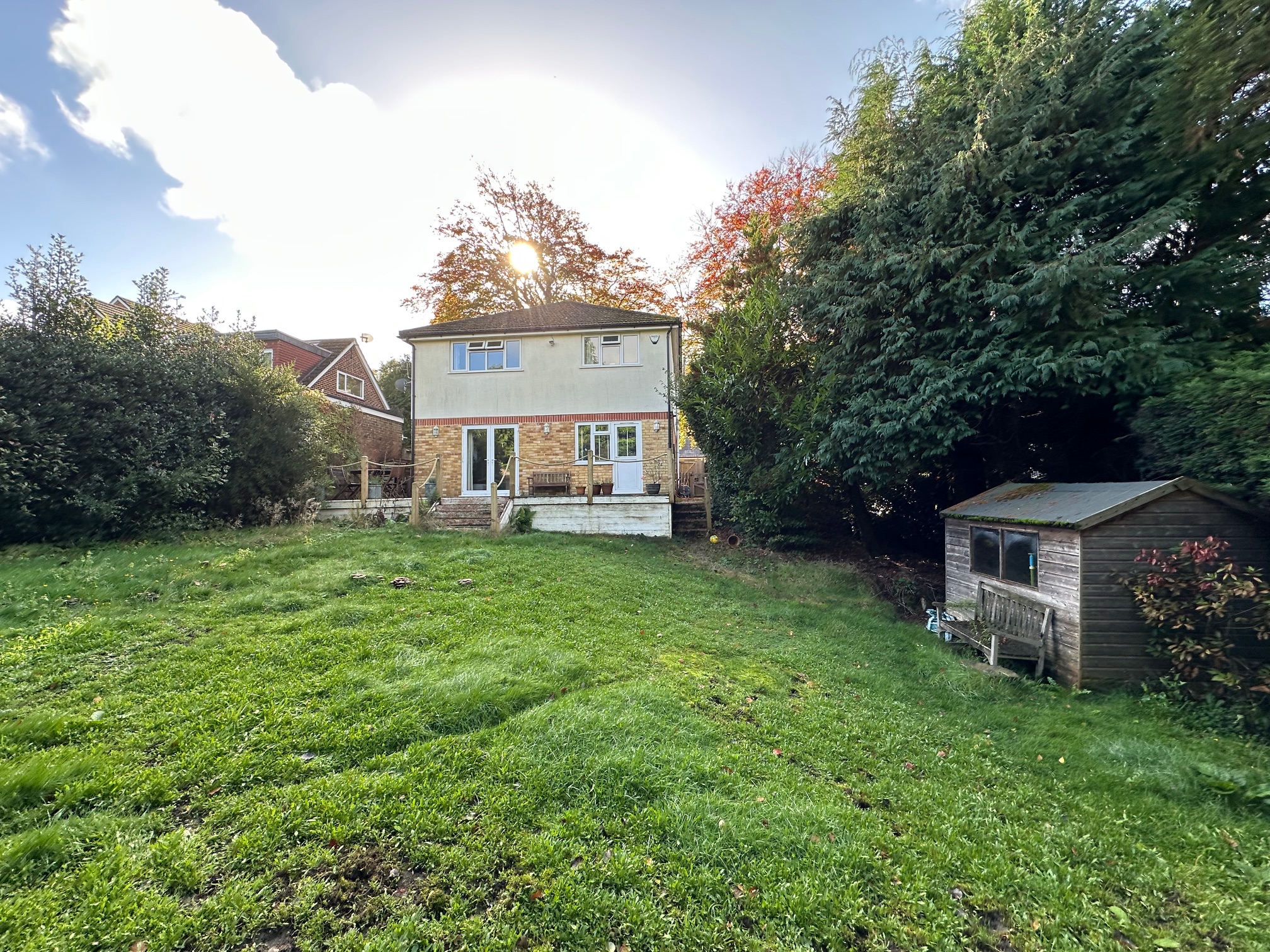 ENTRANCE HALL:- Stairs to first floor, wood flooring, under stairs storage cupboard, leading to:- OFFICE:- (11’10 x 11’3):- Front aspect, wood flooring, double glazed bay window, radiator, with built in closet for coats and shoes. FAMILY ROOM:- (10’11 x 9’4):- Front aspect, double glazed window, wood flooring, radiator and built in cupboard. CLOAKROOM:- Low level WC., wash hand basin, single aspect, double glazed frosted window. UTILITY:- Side aspect, double glazed windows, space and plumbing for washing machine, door to side garden, storage cupboard. LIVING ROOM:- (19’10 x 16’3):- Dual aspect, double glazed window, double doors leading to rear garden, television point, wood flooring. KITCHEN:- (13’10 x 12’3):- An extensive range of eye and base level units with ample work surfacing, one and a half bowl sink unit with mixer tap and drainer, range cooker with five gas hobs and extractor fan above, space for fridge/freezer, built in pull out larder cupboard, built in dishwasher, wall mounted combi boiler, partly tiled walls, wood floor, radiator, rear aspect, double glazed window, door to rear garden. LANDING:- Access to loft space via loft ladder to loft area, access to all rooms, MASTER BEDROOM (14’8 x13’8):- Rear aspect, double glazed window, radiator, two built in wardrobes, door to:- ENSUITE BATHROOM:- Fitted suite comprising panel enclosed bath with mixer tap, independent shower over, two pedestal wash hand basins, low level WC., cupboard, part tiled walls, tiled floor, radiator, side aspect, double glazed frosted window. BEDROOM 2 (12’7 x 11’3):- Front aspect, double glazed window, built in double wardrobe, radiator BEDROOM 3 (9’3 x 8’5):- Rear aspect, built in fitted wardrobe, double glazed window and radiator. BEDROOM 4 (10’10 x 9’6):- Front aspect, double glazed window and radiator. BEDROOM 5 (7’11 X 5’10):- Side aspect, double glazed windows and radiator. BATHROOM:- A four piece suite comprising large panel enclosed bath with mixer taps, tiled shower cubical with multi-function shower unit, wash hand basin, low level WC., side aspect, double glazed frosted window, tiled walls, tiled floor, radiator. OUTSIDE:- To the front the garden is laid to lawn with a raised area and mature tree, driveway parking and access to the garage, mature shrubs. Side garden is enclosed and very secluded, patio area. Rear garden a good sized area of decking with steps down to lawn area all enclosed by mature hedge row and trees, outside tap, outside lighting. GARAGE:- Single with up and over door, light and power, wall mounted boiler, space for appliances .