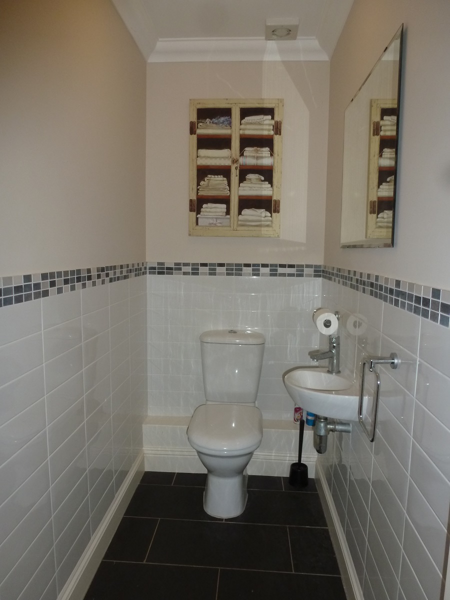 CLOAKROOM: - Low level WC, tiled flooring, part tiled walls, wall mounted wash hand basin.