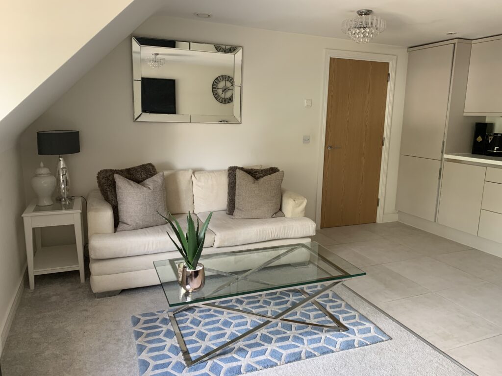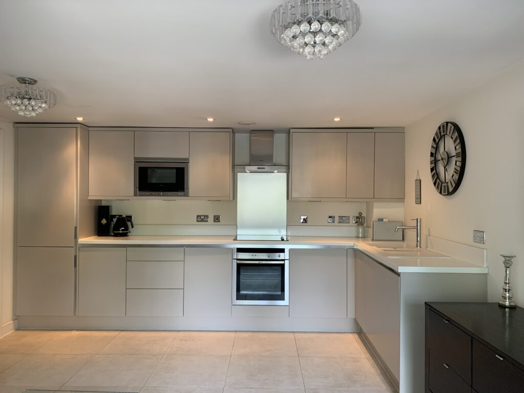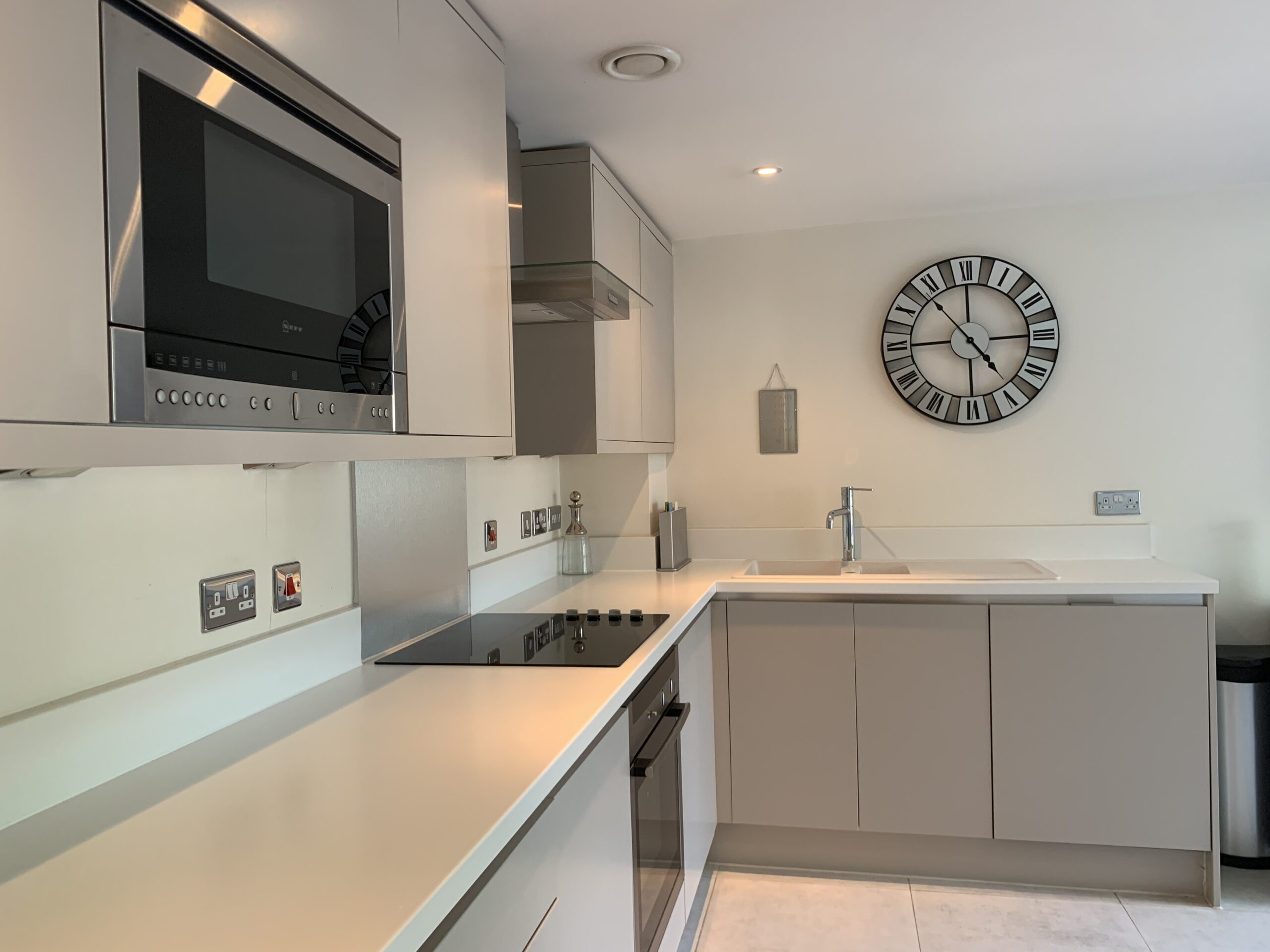 ACCOMMODATION: SECURITY ENTRANCE PORCH: Door to COMMUNAL HALL to:- Stairs to: APARTMENT 8 – Note: Interior finishes: Smooth white painted ceilings. Emulsion paint to walls. White gloss paint to woodwork. Oak effect interior doors with polished chrome door furniture. ENTRANCE HALL: Utility cupboard housing underfloor central heating system, washing machine, alarm system KITCHEN/LIVING/DINING ROOM: (15'9 x 13'9) (4.80 x 4.20) Superb contemporary kitchen made in England by Omega, from their Sheraton Range with sleek work surfaces, up stands and splash back behind the hob. Integrated appliances by Neff include: Stainless steel oven. Dishwasher. Fridge and freezer. Micro wave oven. Ceramic hob. Polished chrome switches plates. Ceramic floor tiles. Under wall unit lights. Extractor hood. Fitted carpets. BEDROOM: (11'4 x 10'2) (3.45 x 3.10) Front aspect, double glazed window, fitted double wardrobe doors to match interior doors. Shelf and chrome hanging rail. Fitted carpet. BATHROOM: Stylish basin and WC from Roca Gap range. Contemporary Roca bath. Thermostatically controlled polished chrome towel warmer. Stylish Vado mixer taps to bath and basin. Ceramic floor tiles OUTSIDE: To the front there are communal gardens leading to main entrance with waste disposal facilities to the left. Driving through the security gates leads to private parking, communal bike park and communal garden.